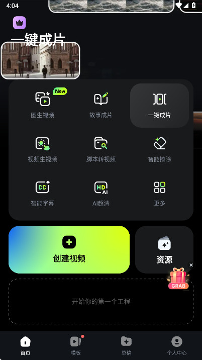 在主界面中,点击中间的“立即创作”按钮,在这个界面中我们可以看到本地素材被分为三类:视频、图片和其他,在右下角可以选择不同相册分类,帮助您快速寻找素材。选择需要导入的视频图片素材,点击“导入”进入下一步剪辑。