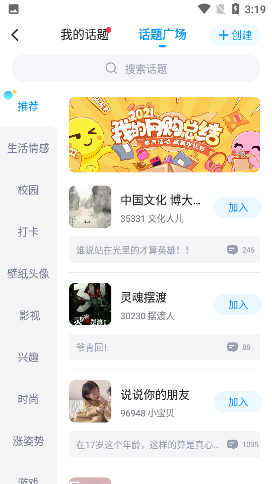・找到或者创建自己喜欢的话题,#过年回家最怕被问的问题#?#隔壁老王#?话题聚友,找到属于自己的圈子