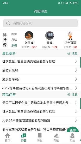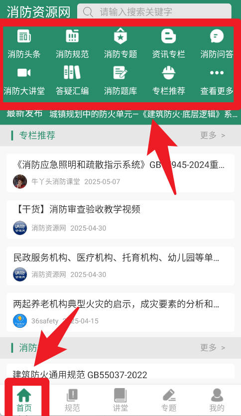 2、在首页功能区,用户可以访问消防头条、消防法规、消防专题、资讯专栏等模块,同时还支持消防问答与案例分享,全面掌握行业最新动态。