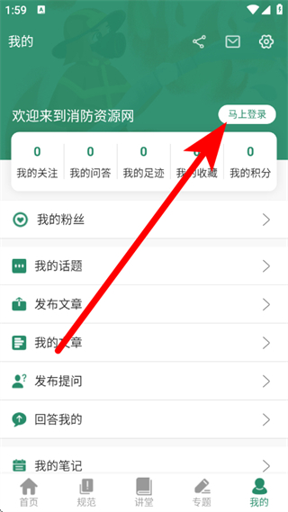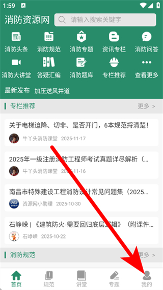 1、打开消防资源网,在首页底部找到“我的”选项并点击,进入个人中心页面。
