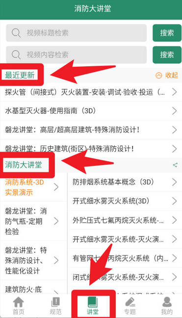 4、在讲堂页面,用户可以查看最近更新的教学视频与课程,涵盖探火装置、灭火系统和防排烟等知识,帮助用户不断提升专业能力。
