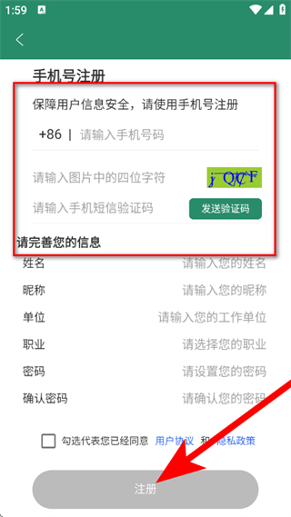 4、填写手机号,输入短信验证码等相关信息,设置并确认密码,勾选对应选项后,点击注册按钮完成操作。