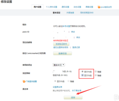 5、点击选择”R-18“后面的“显示作品”后,点击“保存”按钮,如图所示