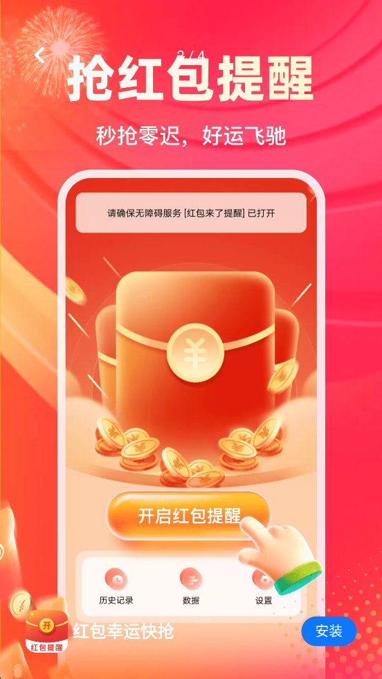红包幸运快抢app是一款非常实用的红包提醒应用,专注于助力用户在各类社交与节日场景中快速抢红包的实用工具,如一位贴心的红包小助手,时刻帮您捕捉稍纵即逝的红包机会,为您的日常社交互动增添无尽的欢乐,凭借智能提醒、灵活设置、清晰记录以及出色的适配性,让你轻松应对各种红包场景,尽享抢红包的趣味。