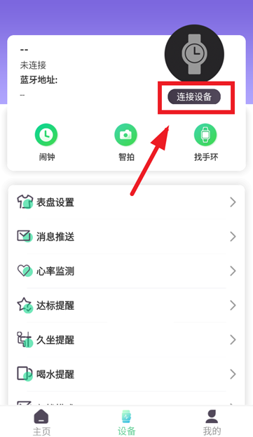 2.开启智能手表,在设备界面点击连接设备