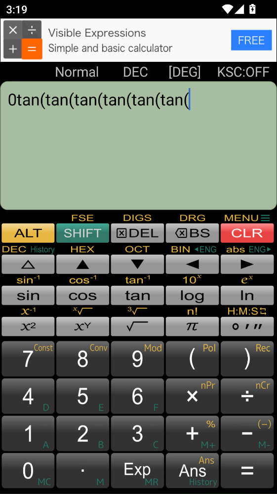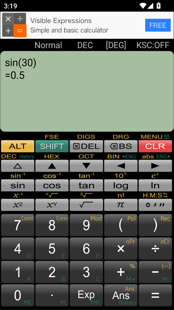 2.例如要算反正弦(arcsin):先按一下黄色的[ALT]键,再按黄色字体sin^-1下方的键,显示屏上就会出现asin( ,只要再键入数值即可。