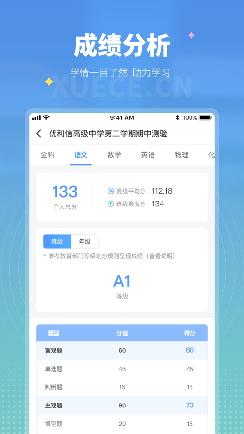 学测网学生版app最新版是专为中小学生打造的学情分析软件,学习情况在app内都为你整理好啦,查询考试成绩,查看成绩排名、对比,整理错题,助你分析知识薄弱点,帮助学生提分,需要的小伙伴赶紧来下载吧。