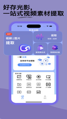 好存光影app是一款功能强大好用的音视频图片提取和处理工具,包含多种功能,满足用户的使用需求。支持识别不同平台的链接并提取音视频文件,还能进行视频处理,包含视频压缩、裁剪、倒放、变速、修改MD5、视频转码、字幕合并等功能,让大家随时都能高效的完成视频处理,还能将音频和视频进行无缝合并,让大家创作出更多优质的内容。