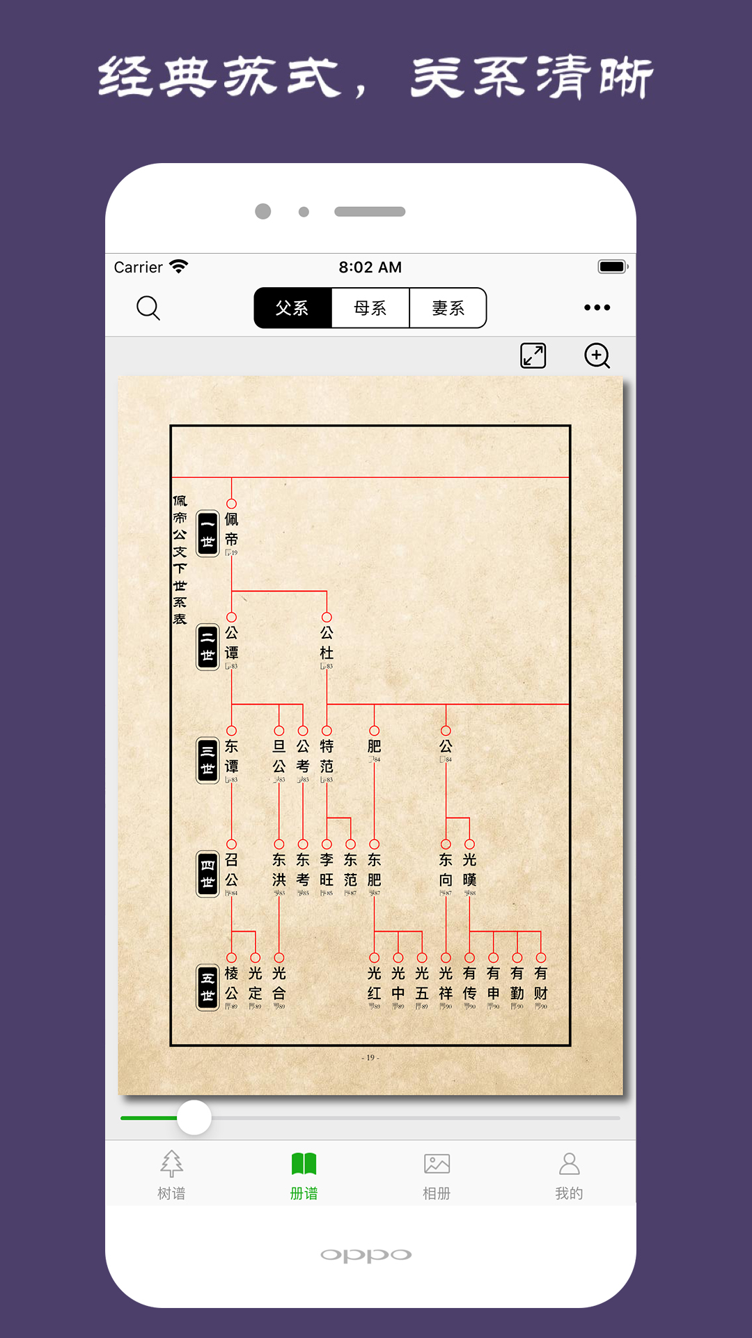 拥有三种家族树,这里支持父系、母系和近亲三种家族树便于分别展示家族的关系脉络;