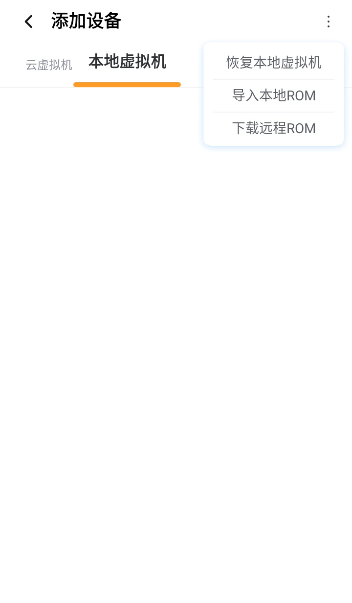 2.进入“添加虚拟机”界面后,你会看到右上角有一个更多菜单,点击这个菜单。选择“导入本地ROM”。