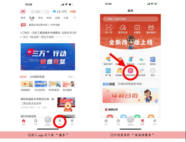 方法二:通过天瑞地安APP-右下角“服务”-菜单栏“家庭消费券”进入