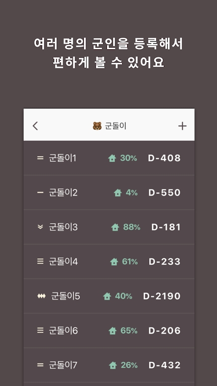由Holy Kiwi研发制作的针对粉丝们追星而准备的追星神器!有一个特别优秀的功能就是,大家可以在这里查到你们的明星偶像服兵役和退伍的时间,这样可以保证你们更准确追星!可以自行调整开始日期,上面的时间是实时变化的。用户可以计算和记录在韩国服役的家人.朋友和偶像的服役时间。主打的是简单易懂的界面风格,并支持多人观看数据!
