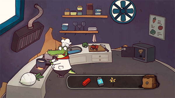 8、进入左边蓝色的小房子中,拾取【大白萝卜】【小刀】(点击鳄鱼可以得知它需要三根胡萝卜)。