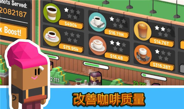 通过开设柜台,选择售卖的咖啡种类,升级可增加咖啡售卖的价格,同时达到一定等级柜台品质也会得以提升,大大增加效益。