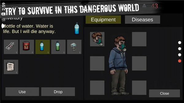 2.然后玩家点击“New Game”进入游戏,打开背包,这里玩家可以看到自己的装备,疾病等等