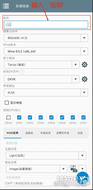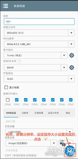 5、新建容器界面下滑,下拉选择‘设定显存大小’(建议手机配置较低的,显存大小调小点)
