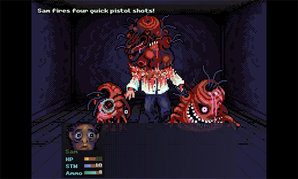 像素风格下隐藏着克苏鲁式的惊悚细节,如血肉蠕动的墙壁、眼球状的监控装置。角色变异过程通过屏幕扭曲与音效强化,营造强烈的心理压迫感。