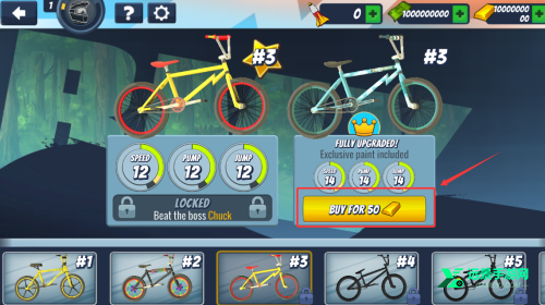 1、点击红框标注的黄色购买按钮,花费50金币获得3号自行车。