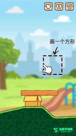 1、第一关:拯救猫咪,在杠杠右侧绘制一个正方形,让其翘起木板即可救出猫咪。