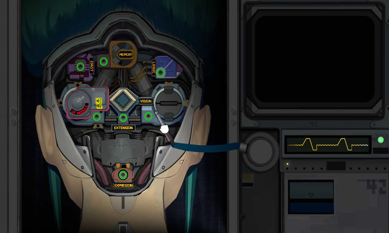 玩家能够使用螺丝刀剪线钳等工具拆解机器人的后脑或胸腔,检查电路故障,区分物理损坏与心理病症