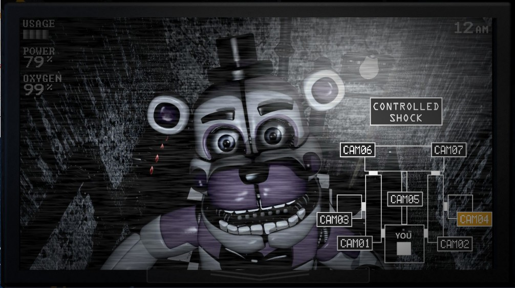 2、监控与防御机制:游戏界面的左右两边各设有一扇门,门边的按键能够操控门的开合以及灯光的启闭。门可以阻拦人偶闯入,灯光则能搭配门上的玻璃来确认人偶是否已经离开。玩家还能通过点击屏幕正下方呼出监控界面,切换不同区域的画面,实时掌握人偶的方位。不过无论是开关门、开启灯光还是使用监控,所有操作都会消耗有限的电量,一旦电力耗尽,防御装置便会无法运作,危险程度将骤增。