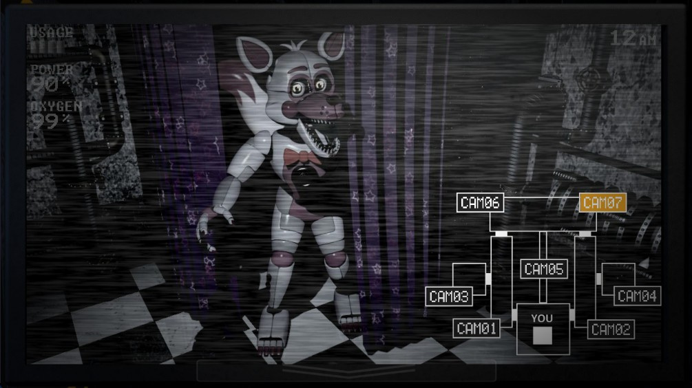 3、经典娘化角色:游戏中的娘化角色各自拥有独特的攻击手段和行动轨迹。例如潜藏在左侧过道的弗雷迪,当它靠近时玩家必须及时关闭左门,它离开时会用敲门声发出提示;海盗湾的邦尼若被玩家通过监控观察到,就会发出尖叫导致监控失灵;奇卡会在特定房间聆听音乐,玩家需要在音乐停止时及时切换监控画面,不然就会触发它的攻击。此外还有会拆解自身零件潜入房间的霍斯,对它进行监视能够降低其进攻的速度。