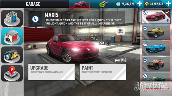 1、打开在本站下载的极限汽车驾驶模拟器2,进入游戏后,点击上方的汽车图案,玩家可以在右方选择你想要的车辆;