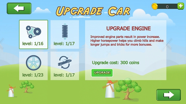 多载具分支升级线:提供吉普车、怪物卡车、坦克、自行车等十余种载具,每款升级路径独立。可强化引擎功率、轮胎抓地力、悬挂避震、四驱系统等部件,不同配置适配沙地、雪山、月球等差异化地形。