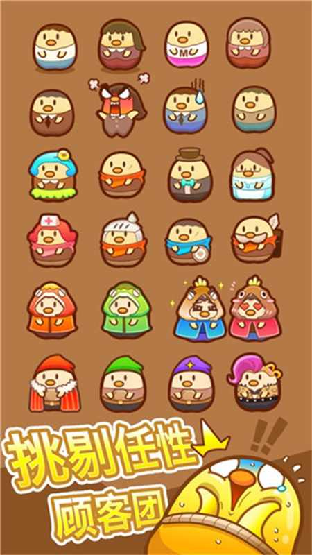 1、首先我们来了解一下这款游戏的大致内容,玩家作为一只家徒四壁的可爱的打工小鸡,需要协助餐厅的服务生,服务好每一位顾客。在游戏中玩家可以为小鸡们换上逗趣可爱的服饰,还可以为餐厅招募各式各样的厨师,同时还有各种离奇搞怪的事件,不同风格的餐厅任你挑战,当然这就要靠你的头脑来通关啦。