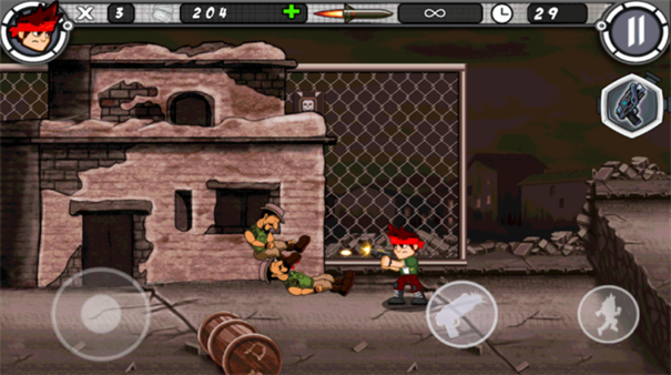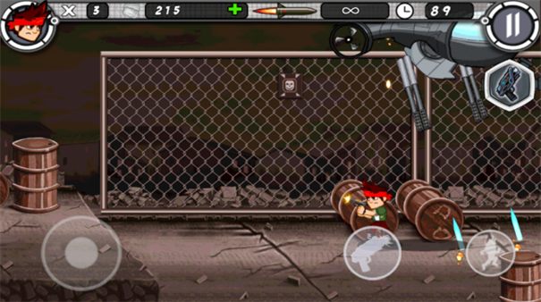 针对于这款游戏的玩法也比较简单,玩法类似于合金弹头,在这里玩家将控制角色,利用虚拟摇杆进行移动及射击方位,点击开火射杀敌人又或者利用跳跃躲避敌人子弹的攻击。
