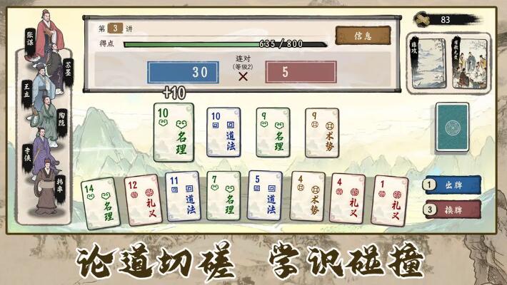 诸子百家模拟器安卓版是一款很好玩的策略类游戏,玩家在游戏中将会扮演一位在东周时期周游列国的士子,经历诸侯争霸和百家争鸣的历史大势。游戏主要有两个玩法,一个是通过卡牌机制和其他的学派进行辩论,玩家需从随机发放的手牌中组合出有效牌型,在限定回合内累积得点以取胜。还有一个是诸子百家模拟器安卓版在各诸侯国成功传道后,可获得“周游列国”的增益状态,提升后续活动的收益。