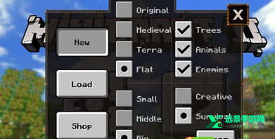 2、玩家可以自由选择,另外打钩的位置是三种选项可以选择是否有树、动物和敌人,还可以选择地图大小并且游戏模式,包括创意模式和生存模式,