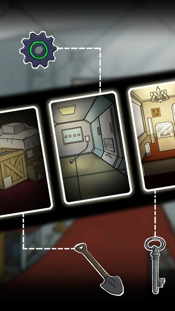 左边门把手,可卸下,装到正对面门上,打开得铁锹,花盆里挖出蓝色齿轮,装到右边门上,将蓝色和绿色位置对换,打开门,从箱子里取出相应物品。