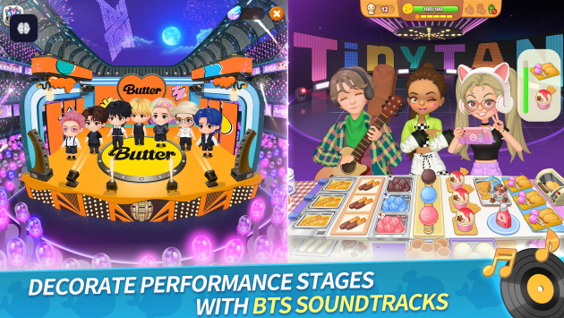 3、TinyTAN Festival Makeover用您的烹饪技巧清理舞台,享受 TinyTAN 在舞台上的疯狂,听着 BTS 的歌曲,包括 [Butter]、[DNA]、[MIC Drop] 等。