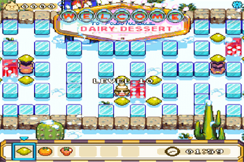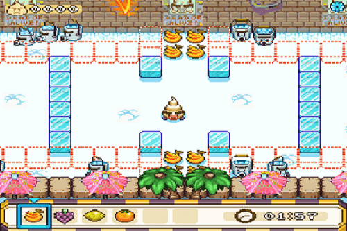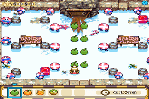 3、使用方向键控制角色移动,按下【A】键执行吐冰或互动动作,根据任务要求完成水果收集与敌人规避。