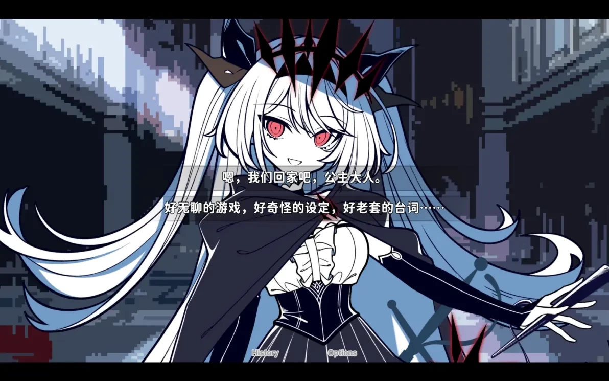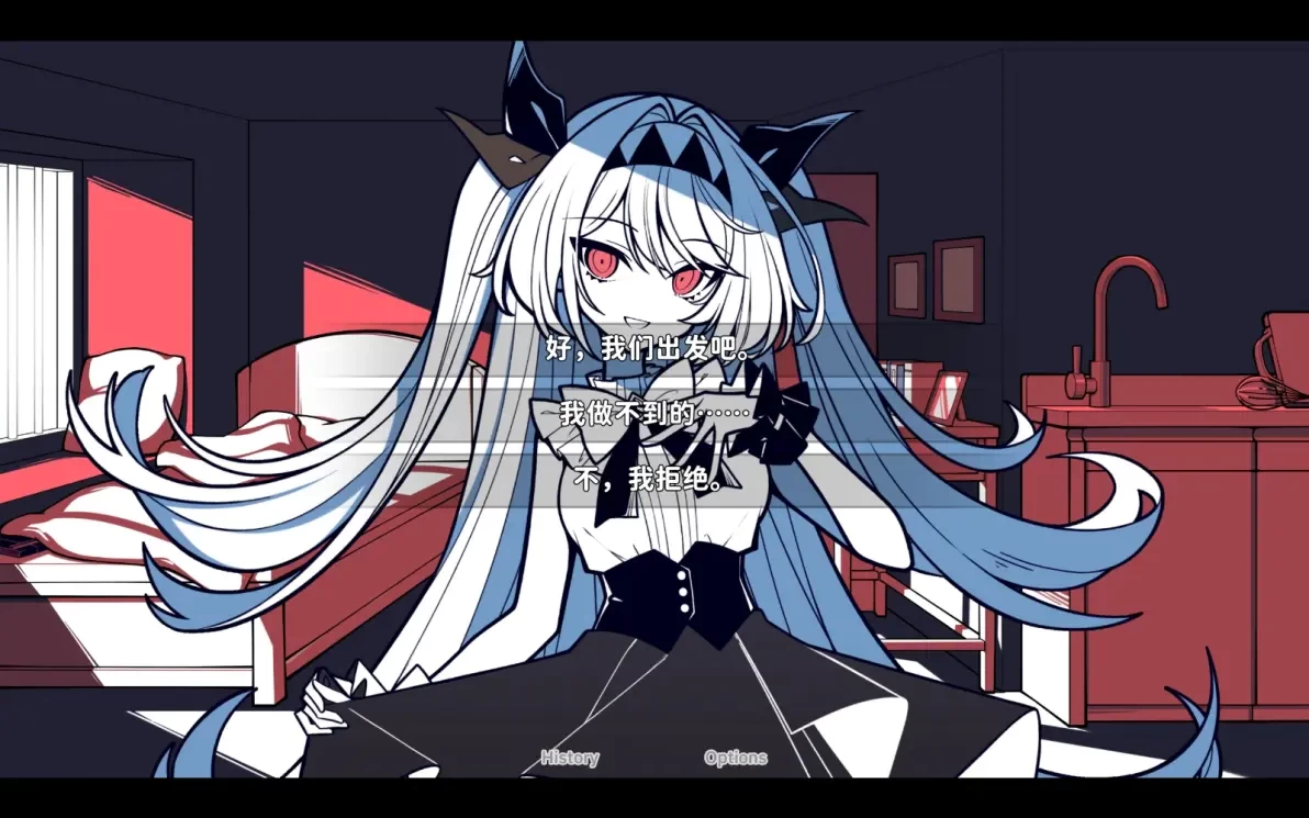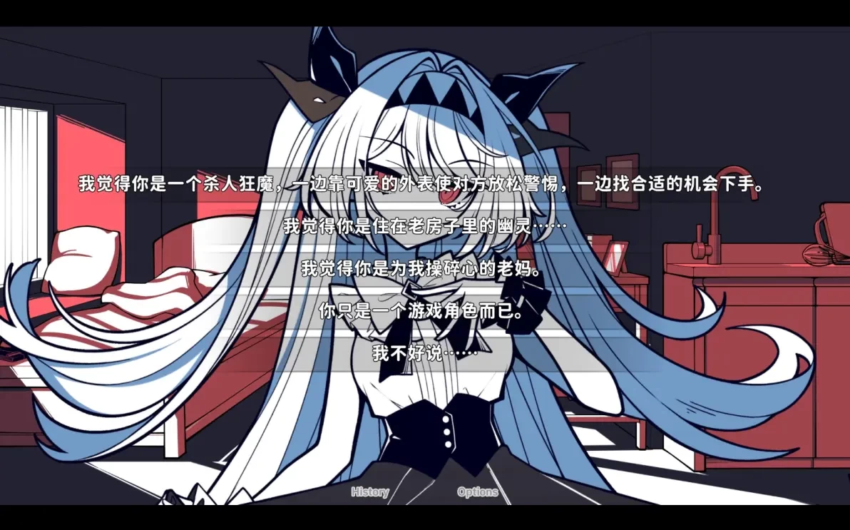 2、结局二:全选否定莉莉丝的选项,达成莉莉丝不存在结局。在不存在结局里,主角掐死了莉莉丝,亲手扼杀了自己的妄想产物,独自一人与生活作斗争。