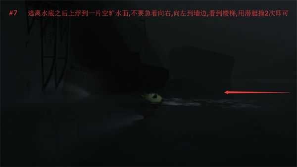 7.逃离水底之后上浮到一片空旷睡眠,不要急着向右,向左到墙边,看到楼梯,用潜艇撞几次即可