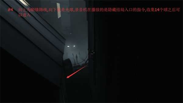 4.以上为剧情路线,向上就是光球,录音机在播放的是隐藏结局入口的指令,收集14个球之后可以进入