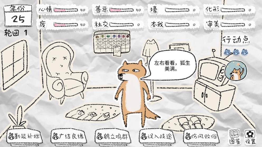 狐里狐涂游戏是一款手绘风格的休闲修仙养成游戏。玩家将扮演一只听信传谣、一心想修炼成精的小红狐狸,通过每25年一个回合的选择修炼,在化形、审美、壕气等属性间权衡取舍,经历各种奇葩事件,最终解锁不同形态的狐狸精结局。游戏以幽默沙雕的剧情和简明的操作,带来轻松诙谐的修仙体验。