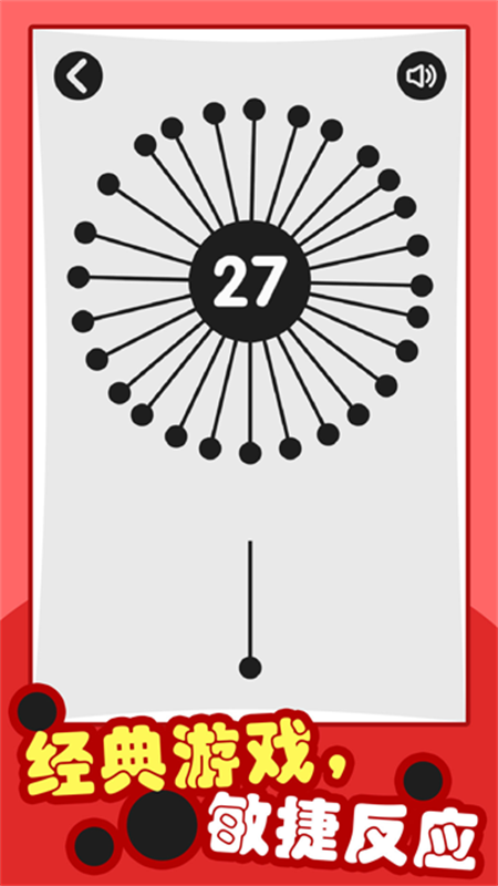 2、每根针插进后便被固定,并且随圆盘一起转动。点击屏幕便可将针插入圆盘。接下来就是要注意的了。如果你的针在插入时,碰上了圆盘上已有的针(无论是系统原有的针,还是后来插进的针),那么就被系统自动判定死亡,该局游戏便自动结束了,想要继续闯关只能重玩。